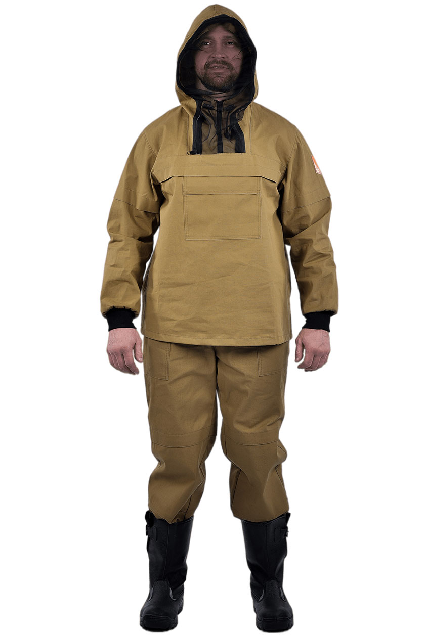 ➠ Куртка прямого силуэта с отрезными кокетками полочки, с капюшоном сложной конструкции, исключающей проникновение насекомых под одежду. Капюшон с противомоскитной сеткой. Низ куртки стягивается эластичным шнуром с фиксатором. Рукава втачные, с трикотажными манжетами-напульсниками.