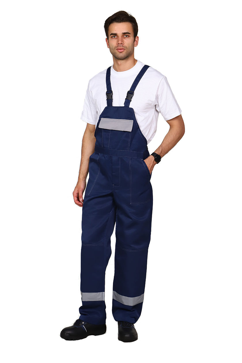 ➠ Полукомбинезон: с застежкой гульфика на тесьму «молния» и застежкой в правом боковом шве на пуговицы. Два накладных кармана с наклонным входом. В области коленей усилительные накладки. На правой задней половинке накладной карман. На грудке накладной карман с клапаном. По низу брюк СОП 50 мм.